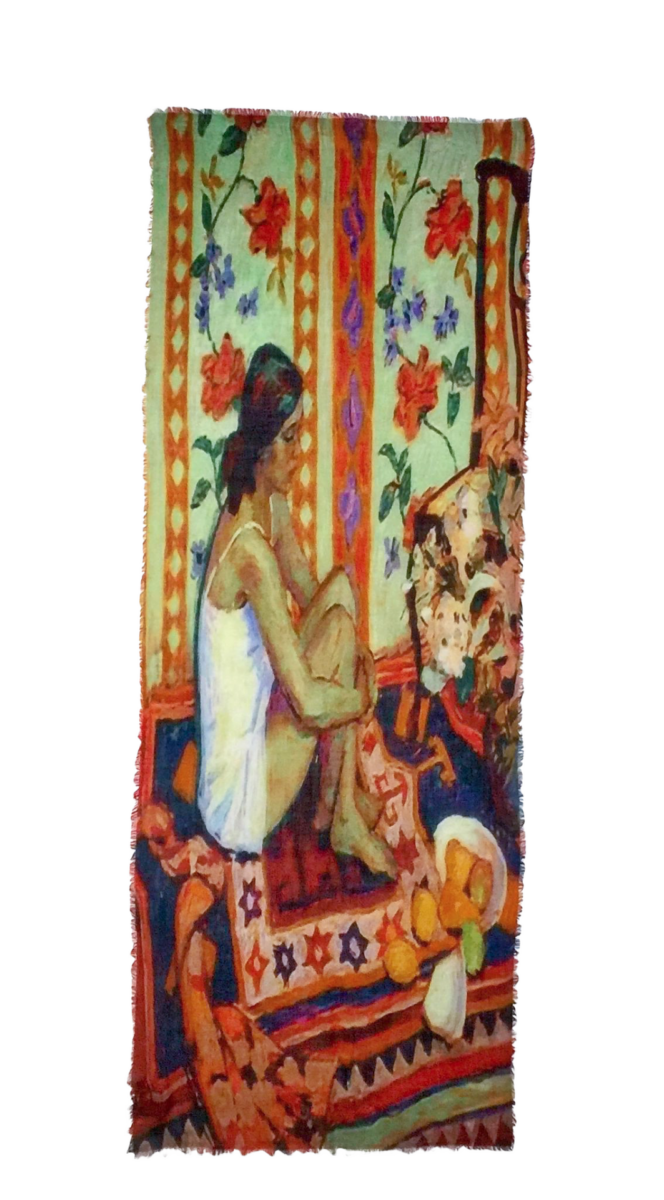 Beautiful scarf with woman on carpet art print from Otra Cosa. Part of our newest collection, this scarf features a striking and artistic design, making it a unique statement piece. Made from 100% high-quality wool, it offers a soft, warm, and breathable feel, perfect for year-round wear. A true eye-catcher for any store and a wonderful gift idea!
