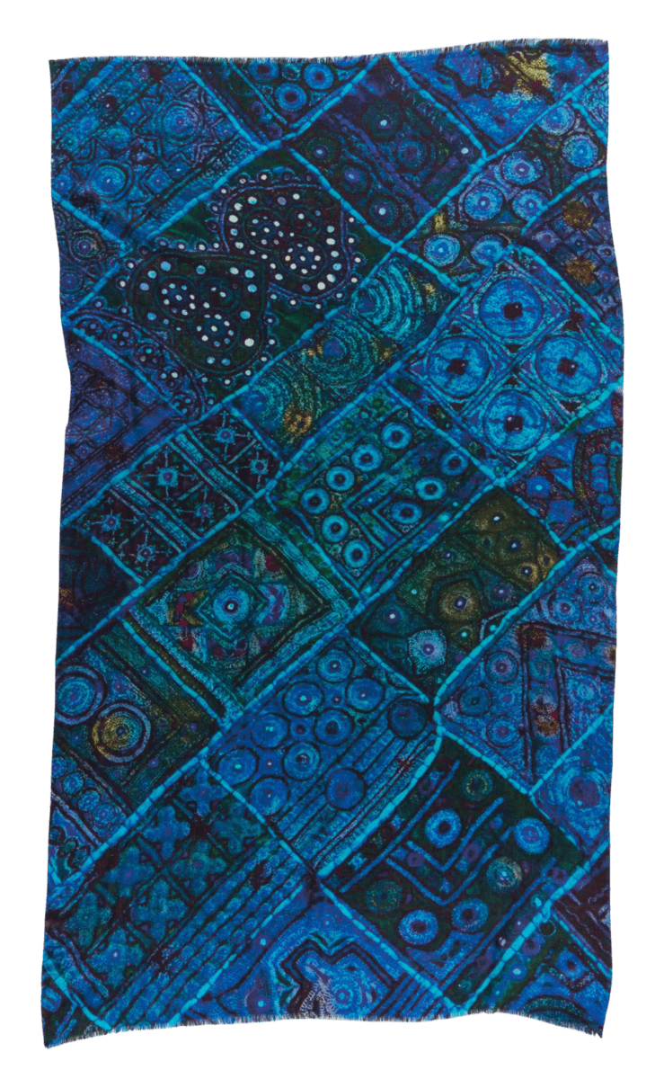 Luxurious wool-silk scarf with Indian Patch Carpet print. This elegant scarf features the rich and expressive Indian Patch Carpet design, inspired by traditional textile artistry and intricate patchwork patterns. The layered motifs and warm, vibrant tones create depth and cultural character, resulting in a striking yet refined accessory.